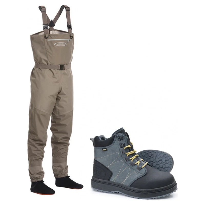 Eine Kombination, die Sie an jedem Fluss oder See trocken hält, die Vision Atom Wathose wird Sie nie im Stich lassen!WathoseEinsteiger-Wathose mit hoher Qualität und Details. Atom ist eine leichte Wathose, die durchgehend aus starkem 3-Lagen-Gewebe gefertigt ist. Die Neoprensocken haben dichtere Unterteile für maximale Verschleißfestigkeit und Langlebigkeit und der Gesamtschnitt der Wathose minimiert die Nähte in kritischen Bereichen. Die große Brusttasche fasst viele Gegenstände und die innere Flip-Tasche ist der ideale Ort für Gegenstände, die Sie an einem sichereren Ort aufbewahren möchten. Die Flip-Tasche hat auch einen Klettverschluss zum Anbringen einer separaten wasserdichten Handytasche. Die verstellbaren Hosenträger und der Gürtel sind aus elastischem Material gefertigt, so dass Sie die Passform für maximalen Komfort einstellen können.• Leichte 3-Lagen-Konstruktion• Wasserdichtes und atmungsaktives F3-Gewebe• Geschwungener NoSeam-Schnitt für perfekte Passform• Farblich passender Gürtel und Hosenträger• D-Ringe &; Zubehörschlaufen• Traditionelle Flip-Tasche mit Reißverschluss• Eingebauter Kiesschutz• Neoprenfüße mit linkem und rechtem SeitendesignWatteschuheAtom ist ein traditioneller Stoffschuh und der leichteste im Visions-Sortiment. Daher ist er ideal für diejenigen, die gerne unterwegs sind und für diejenigen, die nicht die maximale Unterstützung ihrer Watschuhe benötigen’. Das PVC-Material des Vorderteils ist für härteste Beanspruchung ausgelegt und zusammen mit der starken und schützenden EVA-Zwischensohle sorgen sie für eine lange Lebensdauer bei normalem Gebrauch.• Sehr steife Gesamtkonstruktion• Erhältlich mit Filz- und Gummi-Gummisohlen• Kann mit Vision Tungsten-Spikes besetzt werden